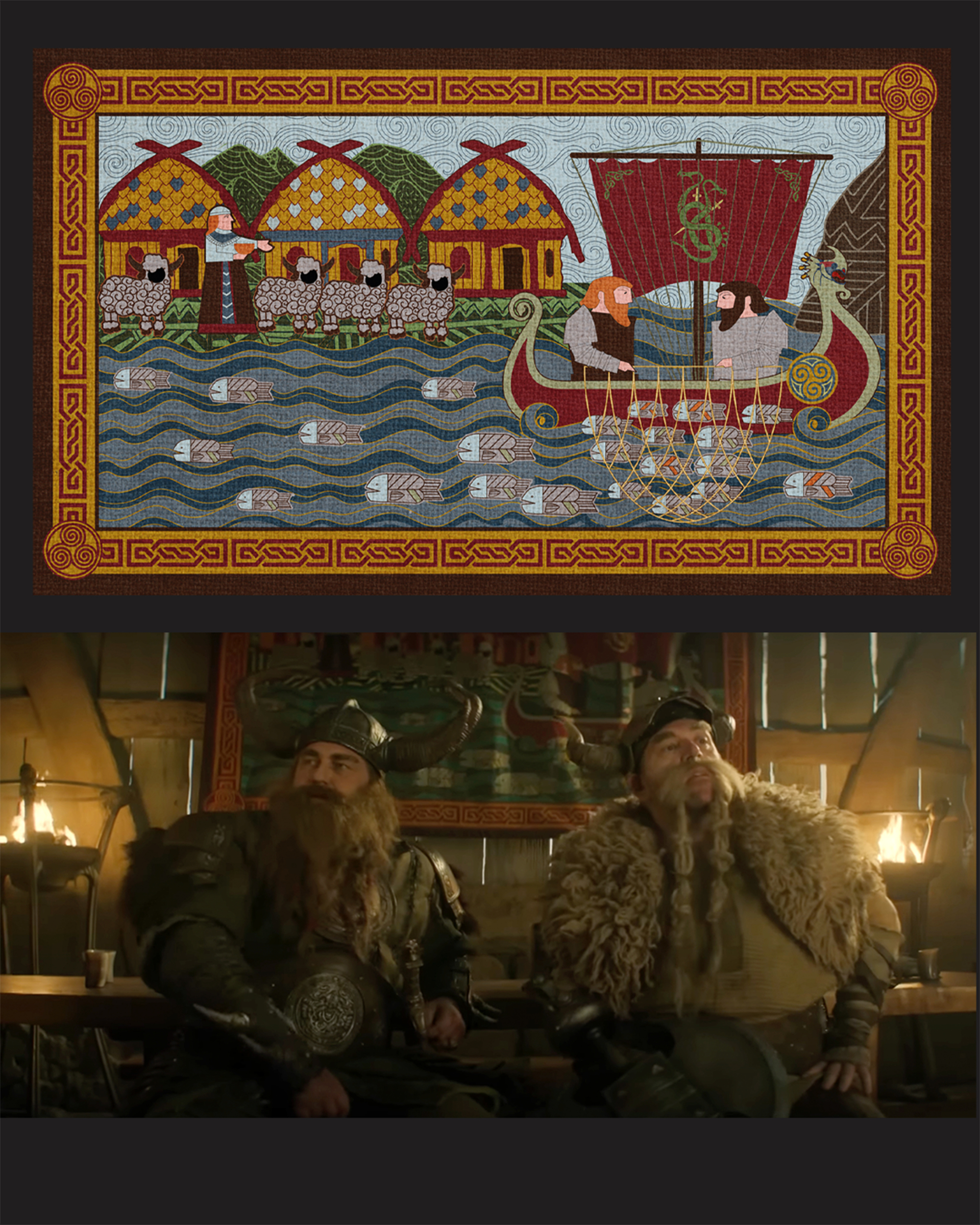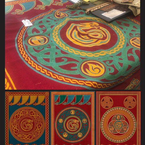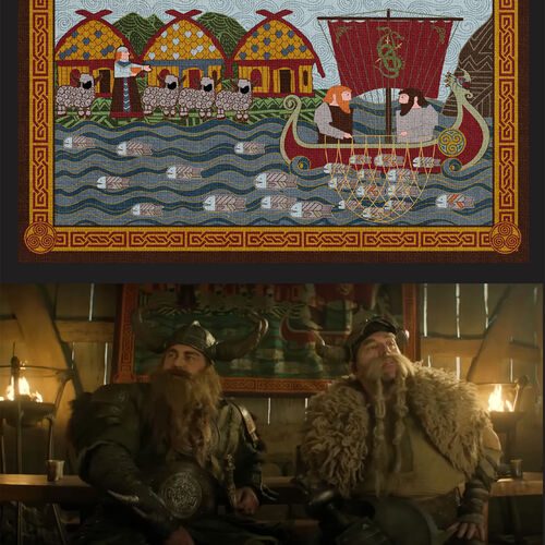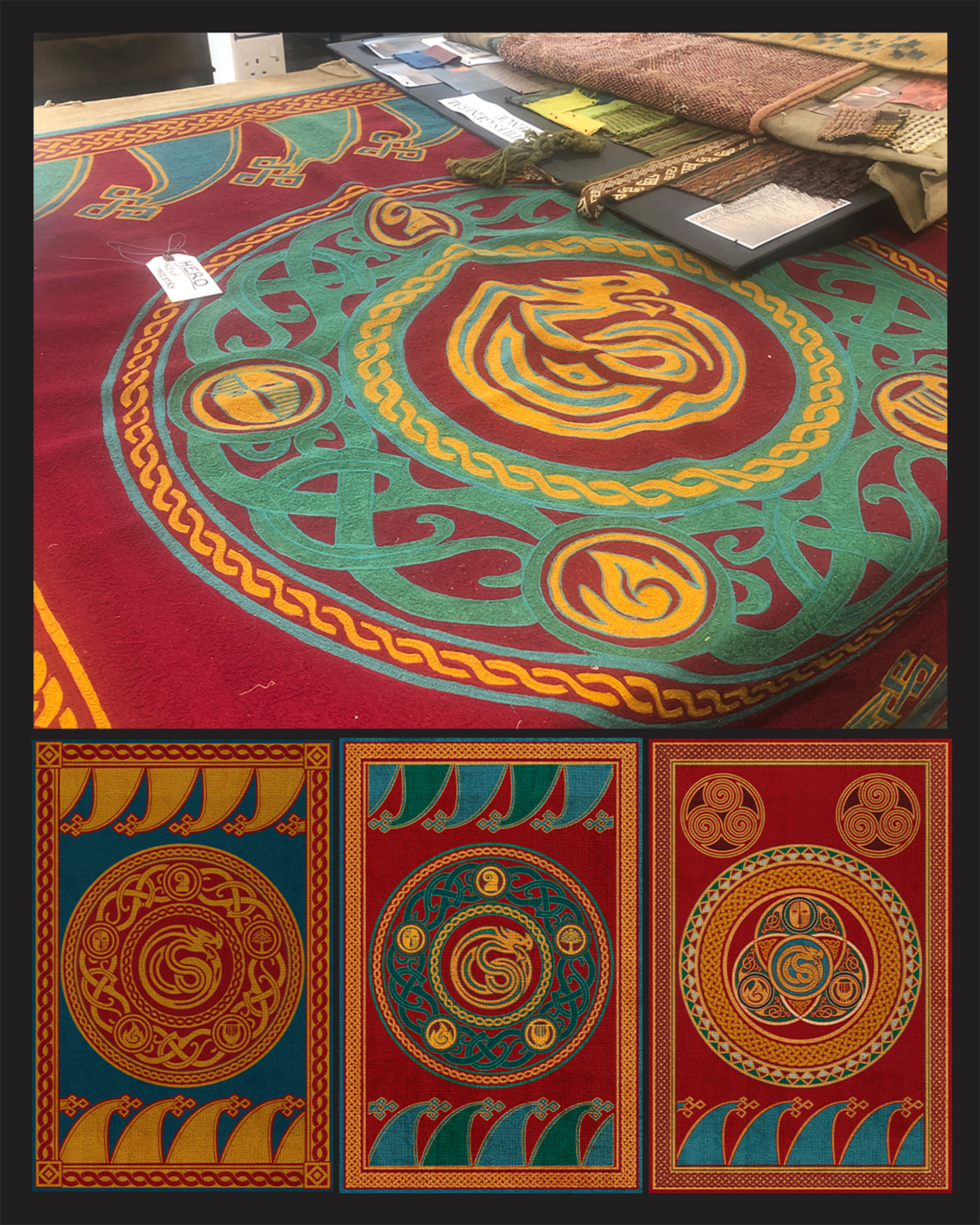 Above: Tapestry Designs for "The Great Hall" Below: A Photograph of the "Great Hall" set taken by Set Decorator Dan Birt.