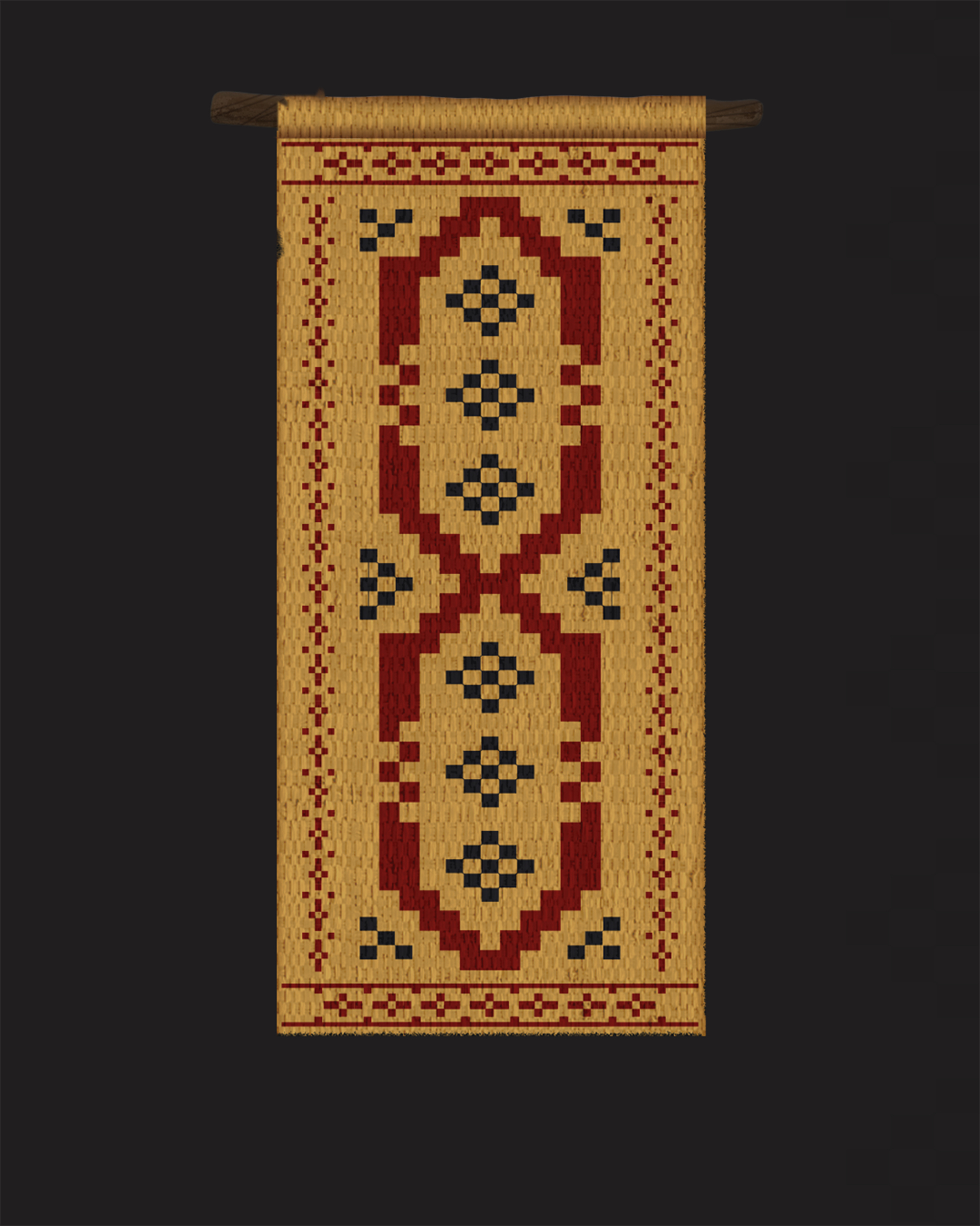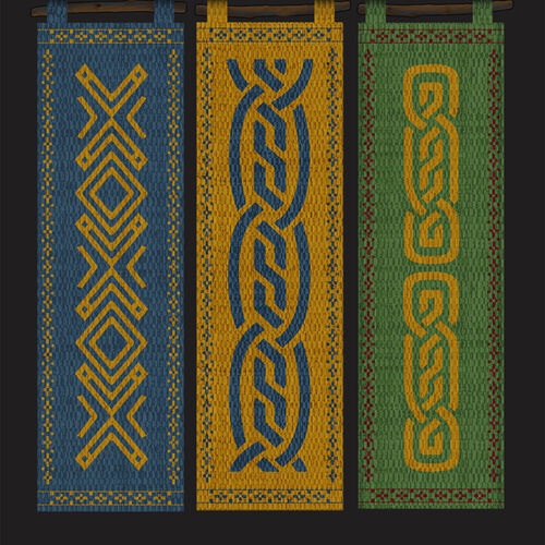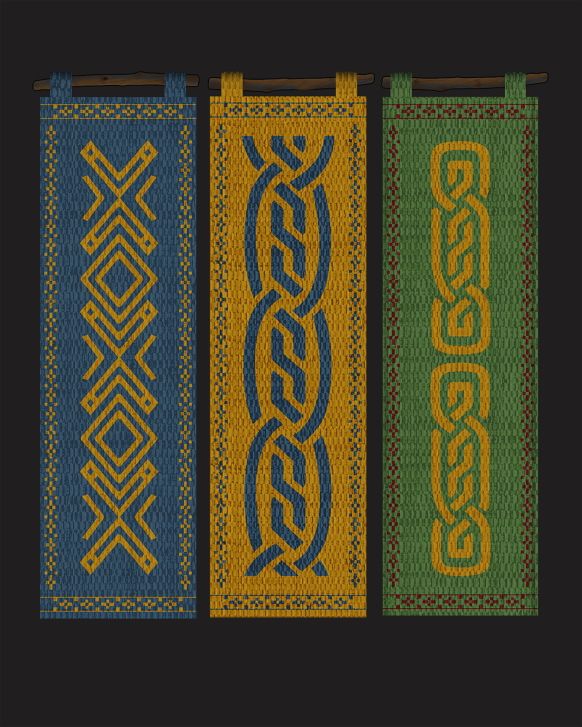 BELOW: Some of the Banners used throughout the film. Each feature a distinctive style inspired by a primary or influential cultural region, such as Scandinavian, Nordic, Chinese, or North African. Despite these varied influences, what unifies them is a limited and controlled color palette.