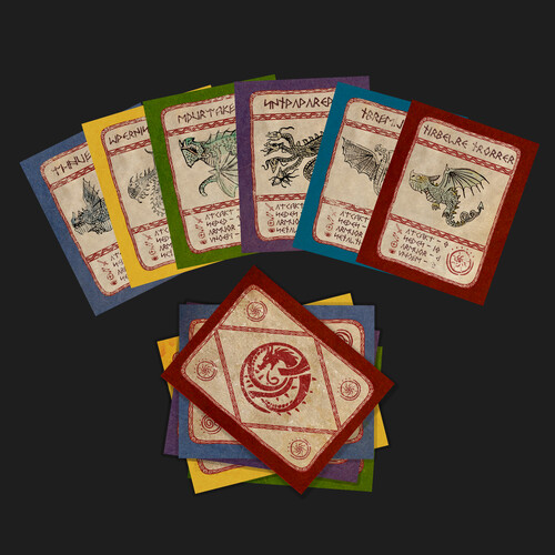 BELOW LEFT: A Sample of the 32 playing trading cards created for Fishlegs. Each card has the dragon stats as well as a colourful illustration creating a multicolour deck